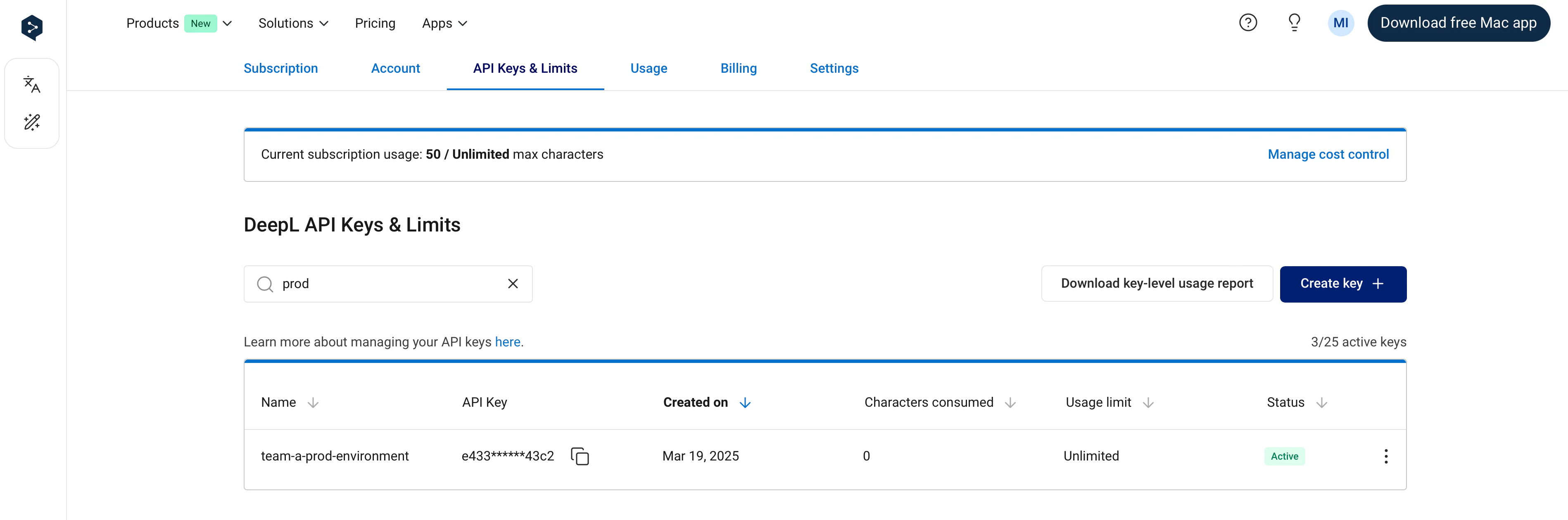 It’s possible to set an API key-level usage limit. Key-level limits restrict the number of total characters (across text translation, document translation, and text improvement) that can be consumed by an API key in a one-month usage period. You can see the dates of your current usage period in the Usage tab. For example, if you set a key-level usage limit of 1,000,000 characters, the API key will not consume more than 1,000,000 characters per usage period. In the “API Keys & Limits” tab, the “Characters consumed” column in the API keys table shows the number of characters consumed by an API key in the current usage period. The character count will “reset” at the start of the next usage period, at which point the key will again be able to consume characters. As with subscription-level cost control:- You’ll receive notification emails when 80% and 100% of a key-level limit has been reached